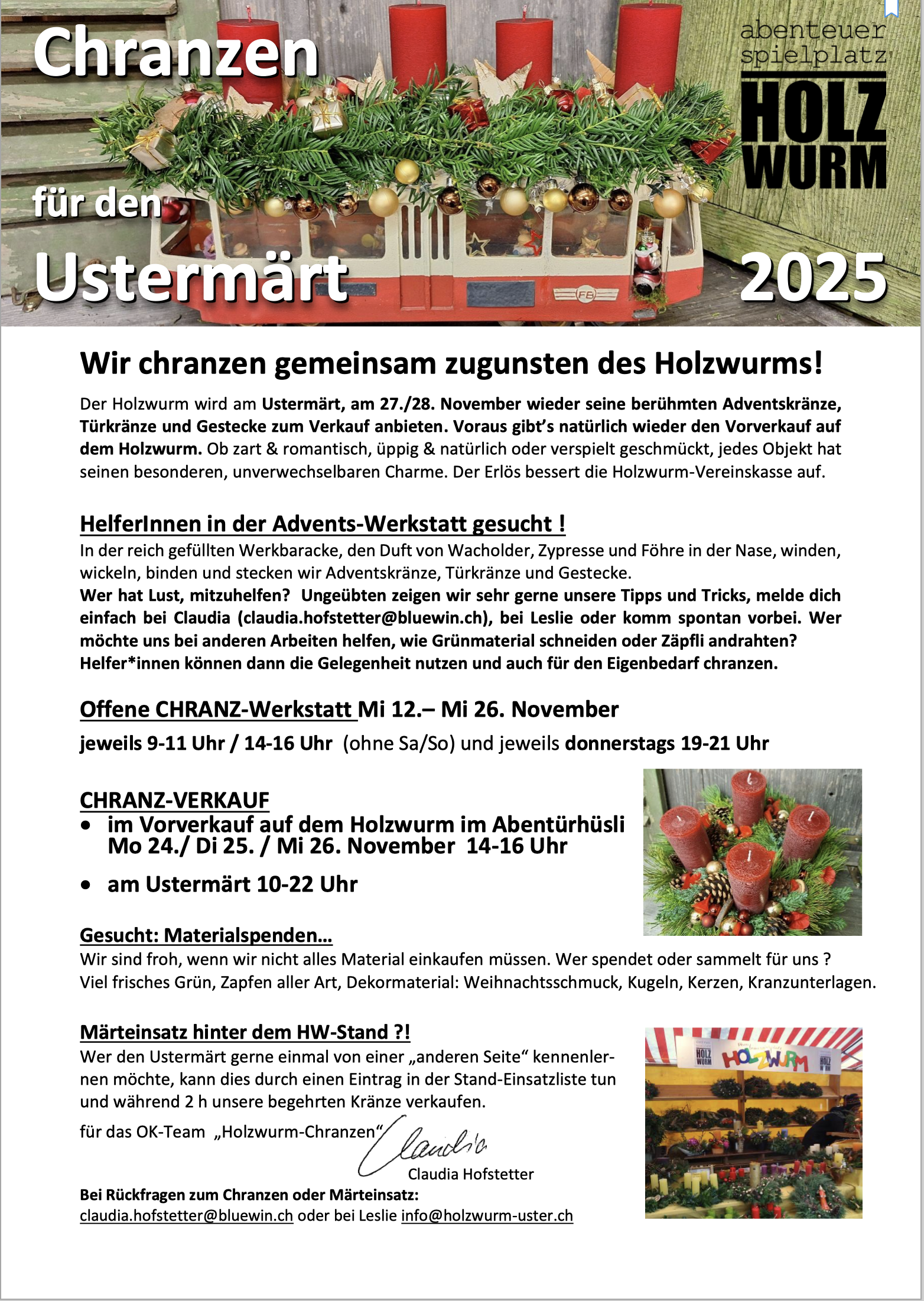Bei Rückfragen zum Chranzen oder Märteinsatz: claudia.hofstetter@bluewin.ch oder bei Leslie info@holzwurm-uster.ch