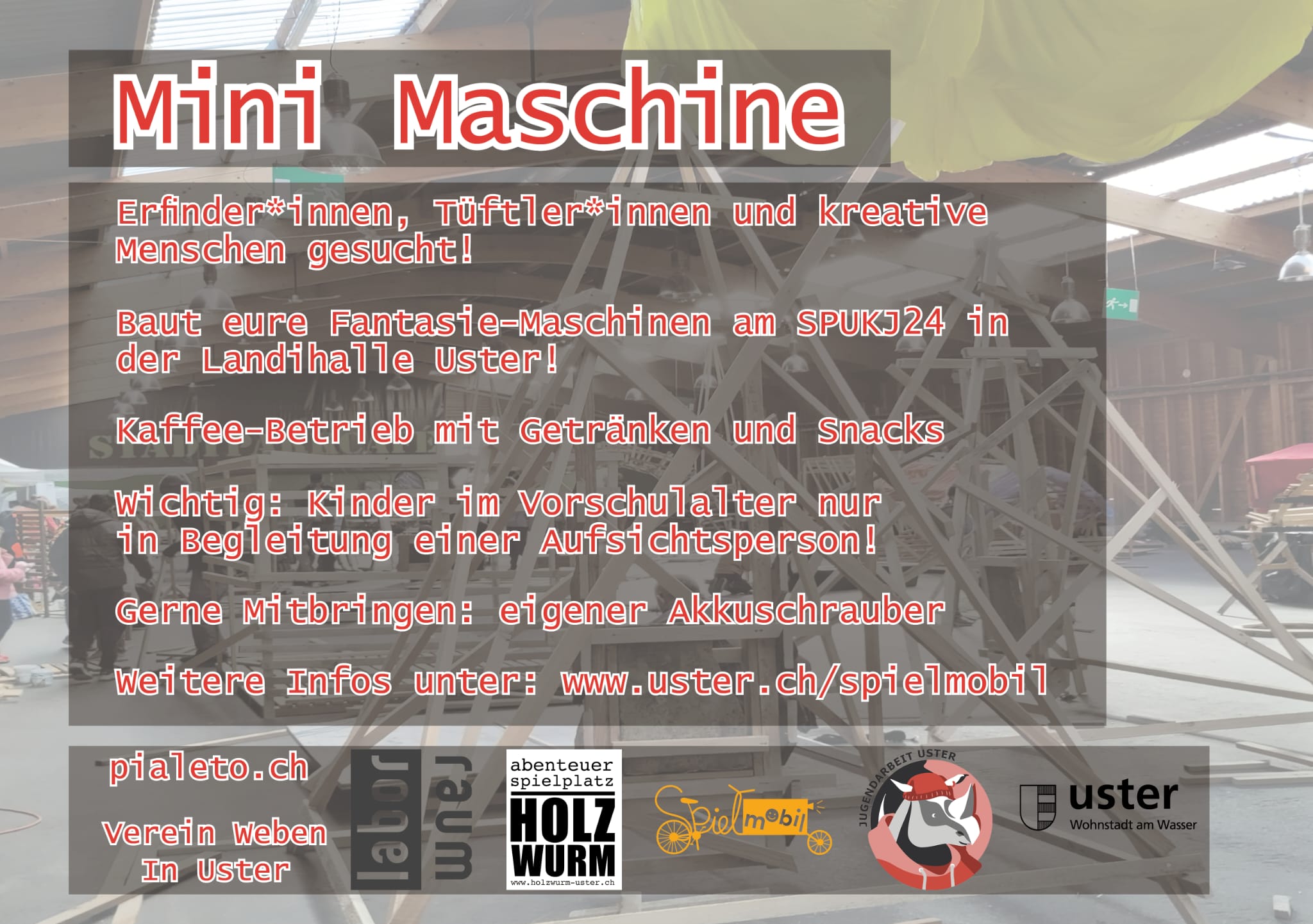 Am Spukj2024 in der Landihalle Uster werden unter dem Motto "Mini Maschine" Fantasie-Maschinen gebaut. Gefragt sind Erfinder*innen, Tüftler*innen und sonstige kreative Menschen. Es gibt Kaffee, Getränke und Snacks. Kinder im Vorschulalter müssen von einer Aufsichtsperson begleitet werden. Die Ferienaktion findet jeweils Montag bis Freitag, von 10 bis 18 Uhr statt. Wer einen Akkuschrauber hat, darf diesen gerne mitbringen. Der Eintritt ist kostenlos.