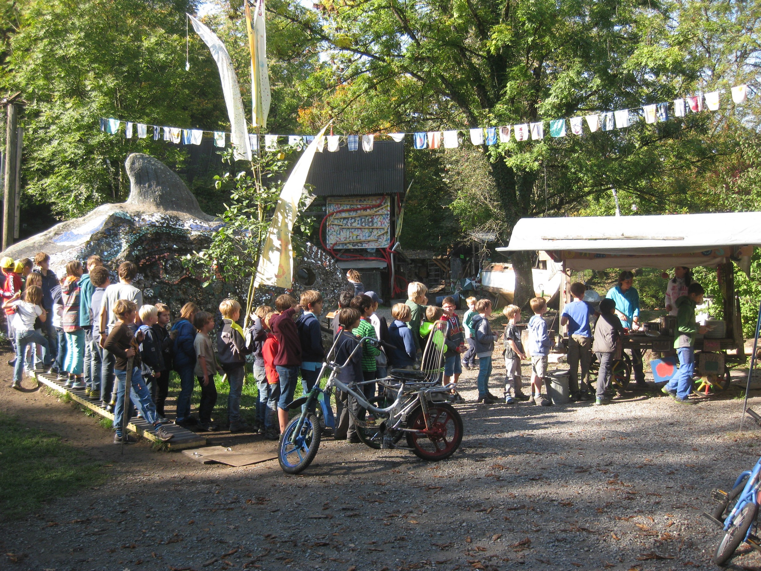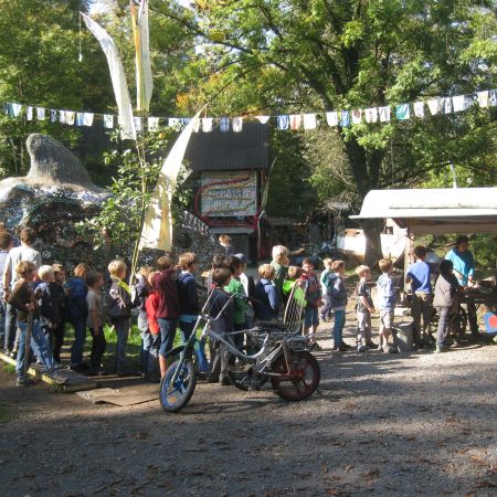 In der von zwei Mädchen eröffneten Minibar konnte man für Holzis feine Drinks geniessen; in der Metallwerkstatt wähnte man sich in Mad Max und die Kids bauten mit Luki ein neues Quartier inklusive Primatenbrücke. Manchmal zogen ganze Banden von mit Holzschwertern bewaffneten Kindern durchs Gelände. Sie lieferten sich - zum Glück unblutige - Gefechte, nahmen Gefangene, befreiten diese wieder aus den Verliesen, um dann wieder friedlich miteinander Speck zu bräteln am grossen Feuer im Hüttendorf. Andere Kinder waren damit beschäftigt, Kürbisse zu schnitzen, Speckstein zu schleifen, Täschchen zu nähen oder sie halfen, aus der reichen Ernte unseres Apfelbaums Most zu pressen.