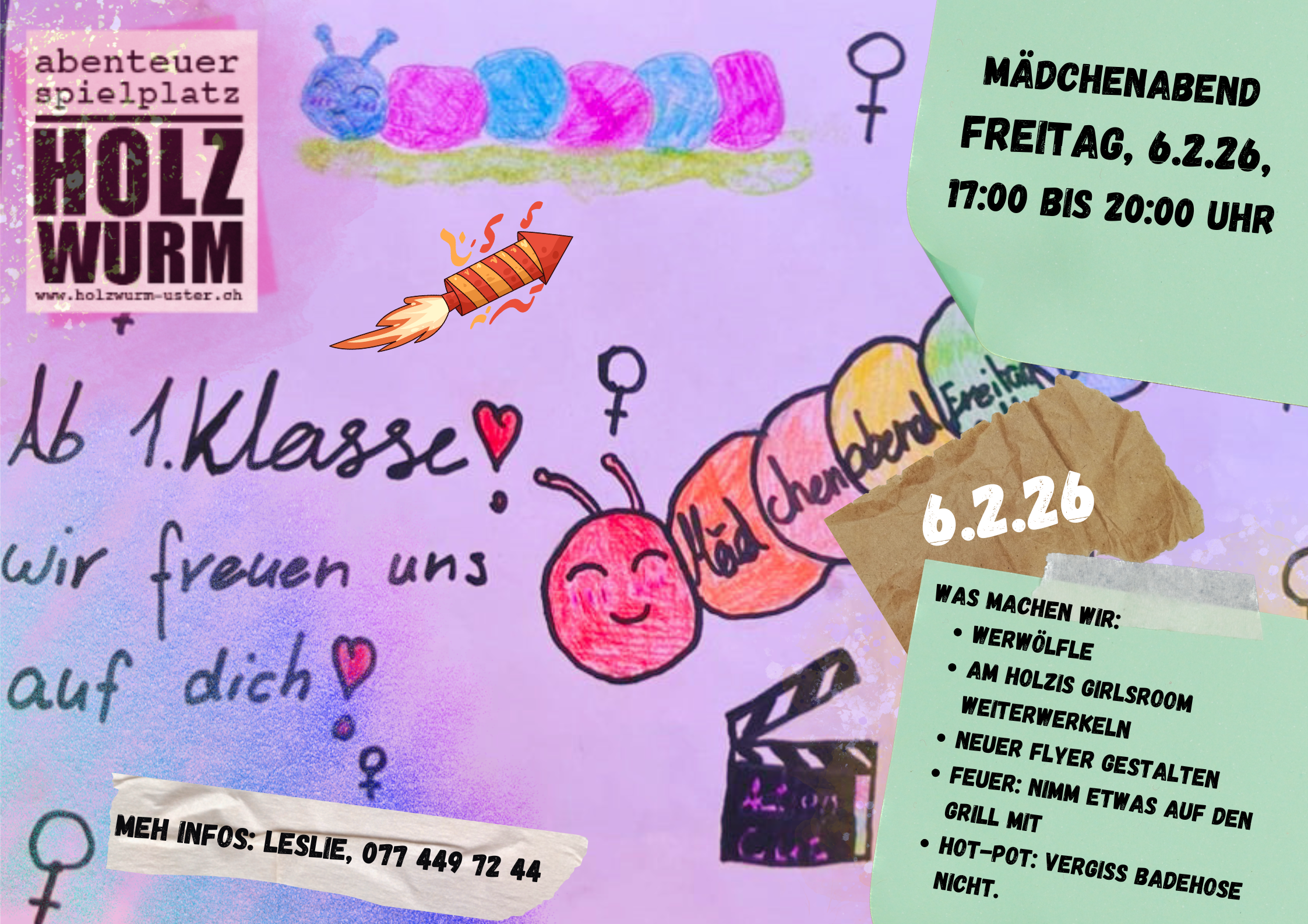 Wir gestalten einen neuen Flyer, spielen Werwolf, werkeln am Girlsroom weiter und schmeissen natürlich auch den Grill an (bzw. machen ein Feuer) - nimm einfach etwas mit, um darauf zu legen. Wenn du Lust hast, zu baden, dann nimm deine Badehosen für den Hot-Pot mit.